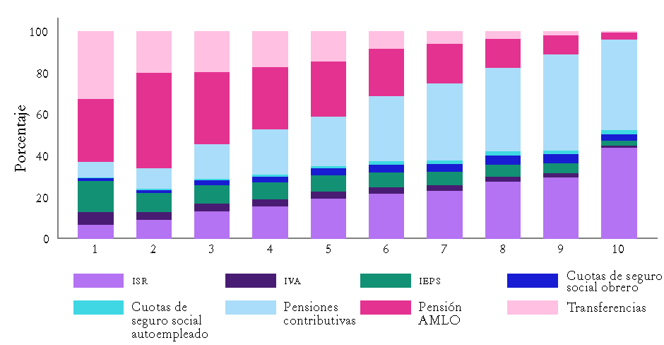 En esta sección se presentan las figuras fiscales de 2022 por deciles de ingreso correspondientes al escenario base. Recientemente ha sido muy discutido que los apoyos de tipo social del gobierno de la cuarta transformación están siendo asignados en mayor medida a hogares no pobres. Sin embargo, un comparativo de las encuestas ENIGH indica claramente que las transferencias per cápita (a valor constante) se incrementaron sustancialmente entre 2018 y 2022, al pasar en el primer decil de 870 pesos a 1096 pesos mensuales, mientras que en el decil de más altos ingresos pasaron de 300 a cerca de 400 pesos en el mismo periodo (Esquivel, 2023). En 2022, año que se analiza aquí con el microsimulador Mexmod, se muestra que las transferencias monetarias de gobierno, incluida la pensión universal (pensión AMLO), significaron una mayor proporción del ingreso disponible en los hogares más pobres respecto de los no pobres, además de que su proporción en impuestos directos es mucho menor en relación con los más ricos (véase la Gráfica 1.