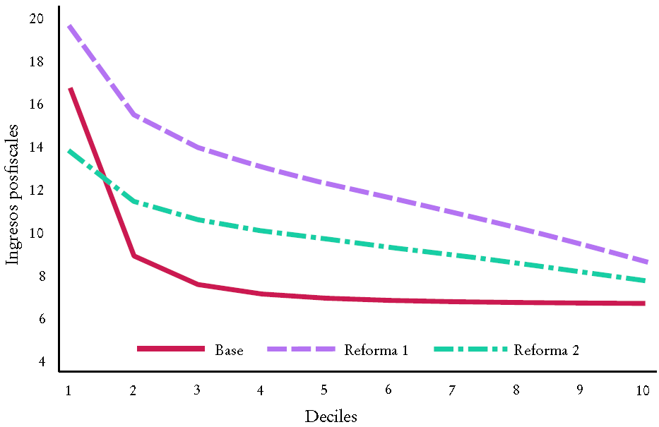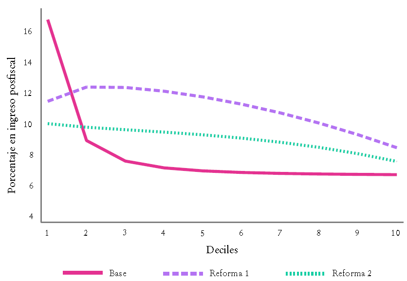 Se estima que el decil más pobre destina en el esquema vigente hasta 16.7% en promedio de sus ingresos al pago del IVA, y el decil más rico, tan sólo 6.6%, cantidad por arriba de los montos obtenidos por IVA en recaudación aportados por el decil más pobre. Con la reforma fiscal aquí propuesta mejoraría la equidad de los pagos del impuesto y los porcentajes de la nueva carga impositiva se reducirían en el decil más pobre a 13.7% y en el decil más rico se incrementarían a 7.5%. La ligera progresividad se explica porque aquellos hogares con ingresos altos tienden a gastar una mayor proporción en bienes y servicios de lujo o gravados con la tasa general en lugar de bienes y servicios con tasas cero o exentas. Al añadir el esquema de la transferencia en ambas reformas fiscales se observa cómo podría compensarse el bienestar en el pago impositivo, cuando la incidencia del pago caería a niveles menores a 10% en los grupos de ingreso más bajo y la pobreza extrema del país prácticamente se erradicaría con la reforma 1 y a un nivel mínimo de 2.3% con la reforma 2 del IVA.