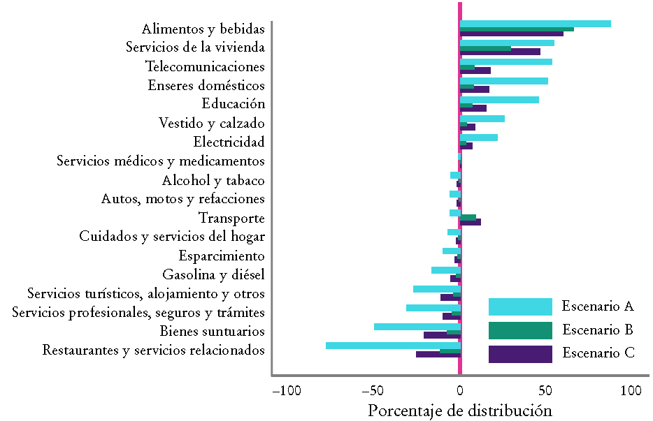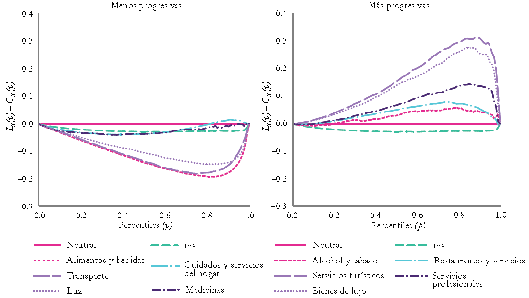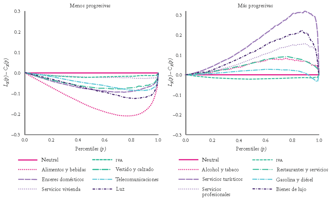 Los productos que permiten un incremento del impuesto (igual o mayor al nivel de la tasa general de 16%) son, en orden de importancia, restaurantes, bienes suntuarios, servicios profesionales, seguros y trámites, servicios turísticos y de alojamiento, gasolina y diésel. También son importantes cuidados y servicios del hogar, transporte, automóviles y motos, así como tabaco y alcohol. Por último, los gastos en servicios médicos y medicinas (que han sido tan polémicos en el país) mejoran la equidad en su pago del IVA, por lo que incluso se reduce el tipo medio del IVA para los grupos vulnerables y se nivela en general la distribución de los pagos fiscales.