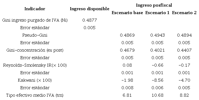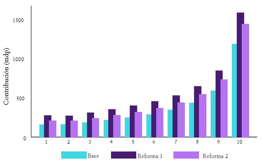 Por su parte, los escenarios de reforma aquí planteados no implican un elevado costo redistributivo social. El índice IR arrojó resultados sin cambios significativos por el escenario de la reforma 2, al pasar de un Gini de 0.487 -antes de la reforma- a un pseudo-Gini de 0.486, lo que indica que esta política impositiva no deterioraría la desigualdad del ingreso y que, por el contrario, permitirá contar con recursos excedentes para orientar el gasto social en áreas tan sensibles como la salud pública.