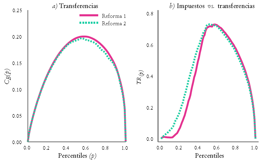 Las curvas de progresividad validan que efectivamente ambas reformas fiscales al IVA, en conjunto con una transferencia, se vuelven altamente progresivas, con un grado de intensidad que explicamos a continuación. En el panel a) de la Gráfica 5 se presentan las curvas de progresividad de las transferencias y su impacto en cada reforma. Ambas curvas son altamente progresivas. La reforma 1 se ubica por encima de la reforma 2; gracias a la mayor recaudación, permite alcanzar una cobertura de 100% de los beneficiarios. Por su lado, la asignación de la transferencia a 81% de la población en condición de pobreza extrema en la reforma 2 sigue siendo altamente progresiva.