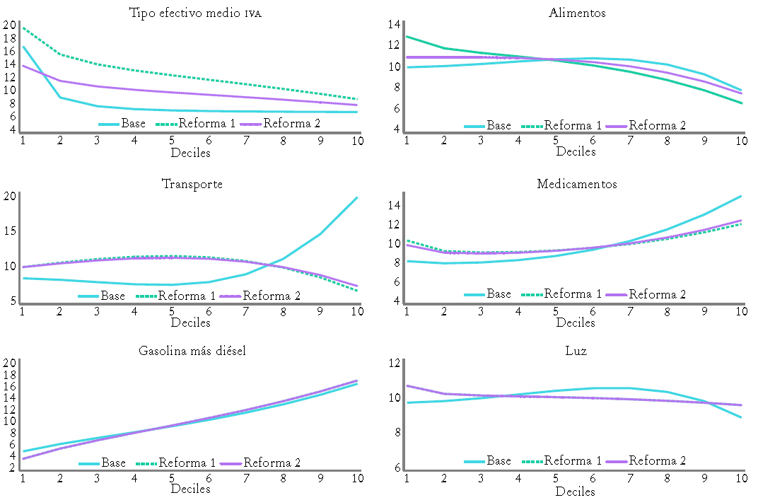 Para México se revela que el decil más pobre destina 16.7% de su ingreso al pago del IVA, en tanto que para el decil más rico la tasa efectiva media es de tan sólo 6.18%, cifra que representa apenas 51.5% de lo que pagan en Brasil. Con el escenario de reforma 2 se logra una mejora en la equidad de los pagos del impuesto, ya que la tasa efectiva media para el decil más pobre sería más baja, con 13.7%, y en el decil más rico se incrementaría a 7.5%. En el escenario 3 las tasas se incrementarían a 19.8 y 8.8%, respectivamente, niveles aún por debajo del caso brasileño.