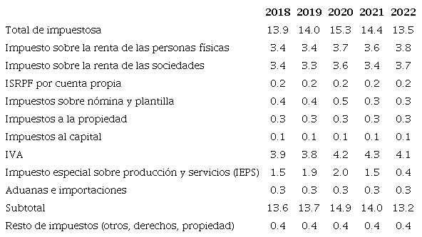 Se observa que en 2020 la recaudación tributaria total obtenida fue la más elevada en todo el periodo, con 15.3 puntos del PIB. Durante los años posteriores a la pandemia de covid-19 de nuevo la recaudación disminuyó de manera paulatina hasta llegar a 13.5 puntos del PIB en 2022, cuyo valor es incluso inferior al que se observó en 2018 (13.9 puntos del PIB). Además, es evidente que se mantiene la rigidez de aumentar los impuestos de forma progresiva y que la figura principal recaudatoria sigue siendo el impuesto sobre la renta, con 7.5 puntos del PIB en 2022. La mayor parte de este ingreso público corresponde al ISRPF, con 3.8% del PIB; seguido del ISRC de las empresas, que equivale a 3.7%; posteriormente del IVA, con 4.1%, y los impuestos especiales, con 0.4%. Solamente estas cuatro figuras tributarias suman apenas 12% del PIB y representan 88.8% del esfuerzo fiscal de la recaudación total del Estado mexicano.