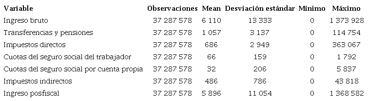 Las bases de datos empleadas aquí provienen del microsimulador de impuestos y transferencias Mexmod. Dicho modelo ha sido desarrollado y validado con los lineamientos del microsimulador Euromod, que incluye los sistemas de impuestos y transferencias de 27 países de la Unión Europea (Sutherland y Figari, 2013), cuyo objetivo es evaluar el impacto que ejercen posibles reformas (de impuestos o transferencias) en la población, en escenarios de tipo contrafactual. Actualmente existen modelos basados en la experiencia europea para más de 40 países. A escala regional, están los modelos Southmod (Etiopía, Ghana, Mozambique, Ruanda, Tanzania, Uganda, Zambia, Vietnam y Ecuador) y Latinmod (Argentina, Bolivia, Colombia, Ecuador, México, Paraguay, Uruguay y Venezuela). En tanto que también se han desarrollado modelos por países como Reino Unido, Serbia, Rusia, Indonesia, Chile y Perú, entre otros (Atkinson, 2015; Sutherland y Figari, 2013; Bargain et al., 2017). Debido a que todos los modelos siguen el mismo marco de armonización de variables de Euromod, los microsimuladores de impuestos y transferencias permiten la comparabilidad de variables entre todos los países y gozan de flexibilidad, simplicidad y transparencia tanto de acceso como de uso. Los modelos -incluido el de Mexmod- están públicamente disponibles en el Centre for Microsimulation and Policy Analysis (CEMPA, 2024).1