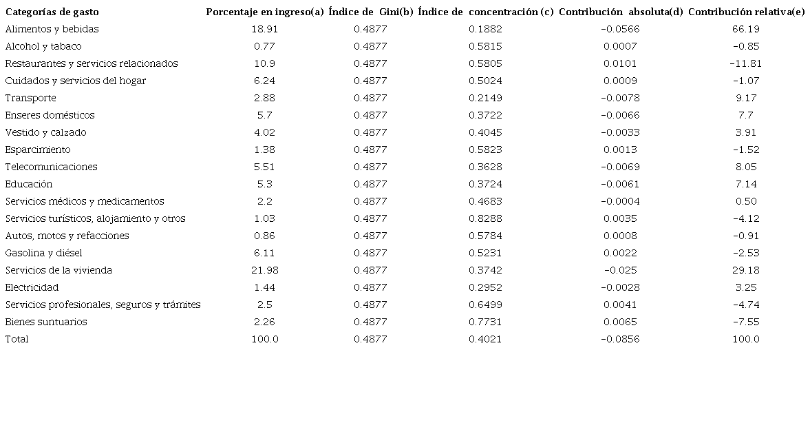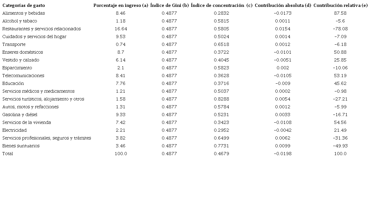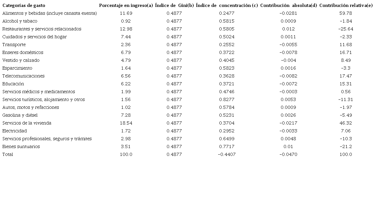 En alimentos y bebidas se observa una elevada participación absoluta en el índice global, por lo que la contribución relativa (columna [e]) también es la más elevada, con un valor positivo de 87.6%, como principal causante de la regresividad del IVA y, por lo tanto, fuente de desigualdad, al ponderar de forma negativa el índice K con mayor intensidad. Otras categorías de gasto con elevada contribución relativa a la regresividad del IVA son los servicios a la vivienda (54.6%), las telecomunicaciones (53.2%), los enseres domésticos (50.8%), los gastos educativos (45.6%) y, en menor medida, el vestido y el calzado (25.8%). Estas categorías invitan ya sea a mantener o a reducir la tasa del IVA. Sin embargo, que los alimentos mantengan una tasa cero genera fuertes distorsiones de subsidio implícito, lo que justifica un aumento de la tasa, pero inferior a la tasa general de 16% (Huesca y Serrano, 2005).