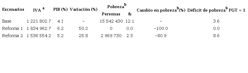 En la reforma 1 la recaudación adicional de 613 160 mdp es superior al costo de la transferencia otorgada en su conjunto de 389 097 mdp (con una cobertura de 100%). Dicha medida erradicaría la pobreza extrema en el país y permitiría alcanzar el primer objetivo relativo al fin de la pobreza de los Objetivos de Desarrollo Sostenible para 2030.