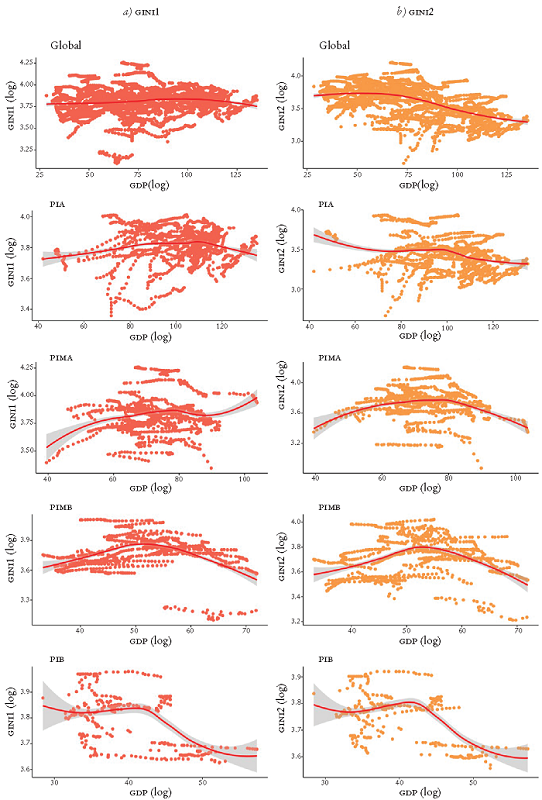 Un análisis inicial de la hipótesis de Kuznets es la forma funcional con la que se ajusta el desarrollo económico y la desigualdad por ingresos, lo que tiene como resultado una relación en forma de U invertida. En las Gráficas 1a y b se presenta el ajuste antes descrito para GINI1 y GINI2 a escala global con todos los datos de la muestra y por grupo de países según el nivel de ingreso. En la Gráfica 1a se observa que, globalmente y por grupos de países -PIA, PIMA, PIMB y PIB-, el ajuste entre GINI1 y la relación con el desarrollo económico sí se cumple en forma de U invertida, lo cual es más claro en los PIMB. De igual forma, en la Gráfica 1b se muestra que el ajuste entre GINI2 y el desarrollo económico sí cumple con la forma de U invertida a escala global y por grupo de países; no obstante, se evidencia que el ajuste, aunque tiene la forma funcional según la teoría económica, presenta ciertas variaciones respecto de la Gráfica 1, donde se presenta el GINI1.