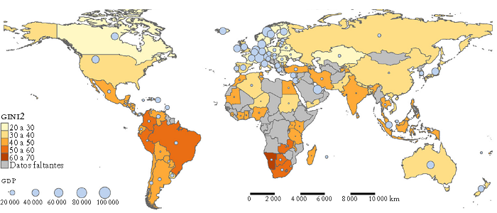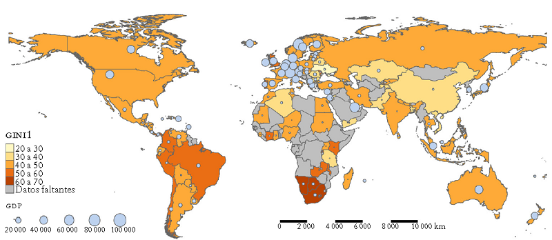 De forma similar, se muestra en los Mapas 1 y 2 la relación entre la desigualdad por ingresos (GINI1 y GINI2) y el desarrollo económico a nivel de países. Podemos observar que existen pequeñas variaciones entre GINI1 y GINI2, las cuales tienden a aumentar o disminuir en cada país, lo que sugiere que existen cambios en el nivel de ingresos y se trasladan a la desigualdad, de manera que se modifica el coeficiente de Gini.