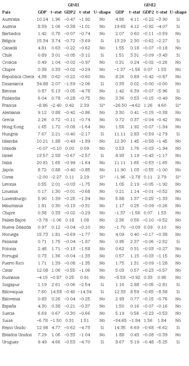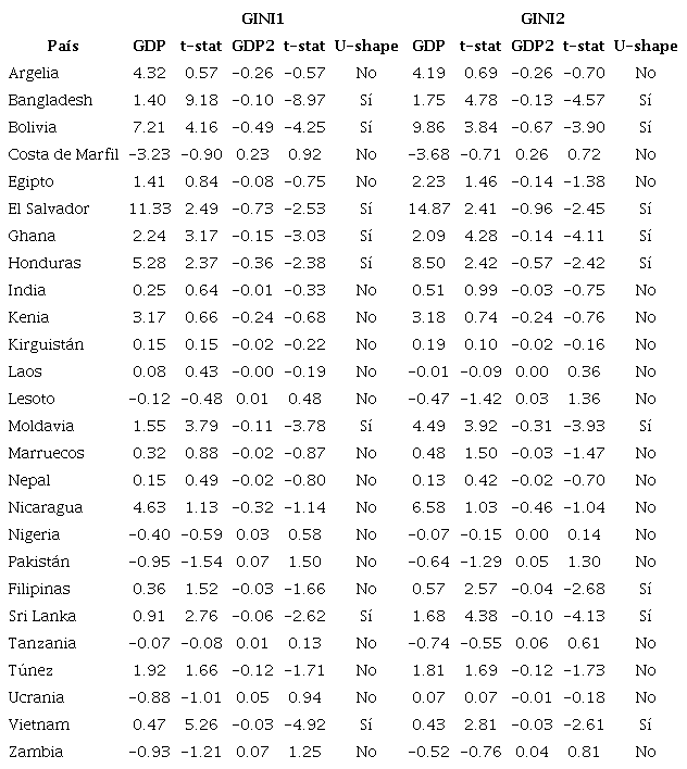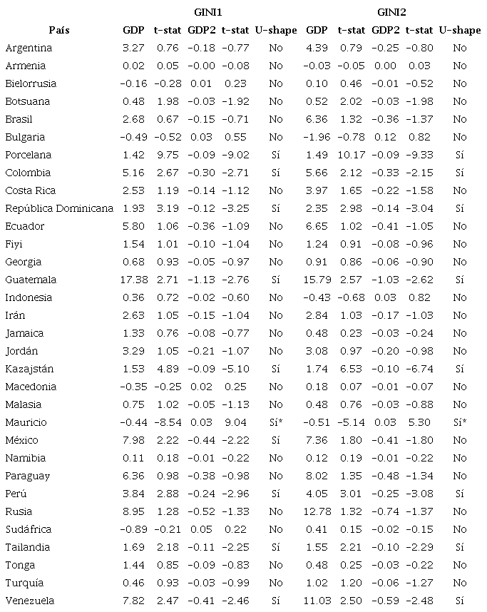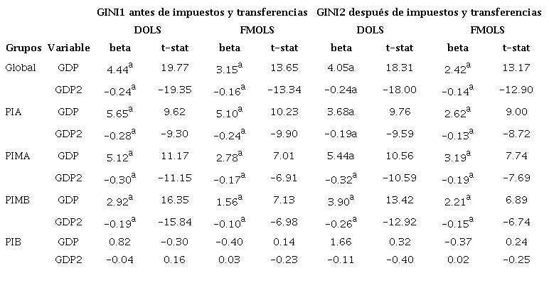 Asimismo, los vectores FMOLS por países del grupo pima validan la hipótesis de la U invertida de Kuznets para China, Colombia, República Dominicana, Guatemala, México, Perú, Tailandia y Venezuela, donde la dirección y la significancia están presentes en los vectores. Por el contrario, Mauritania posee una forma de U contraria a la propuesta por Kuznets, que sugiere que los niveles de desigualdad están en aumento en la segunda etapa de desarrollo. Estos resultados son significativos y mantienen su dirección en GINI1 y GINI2.