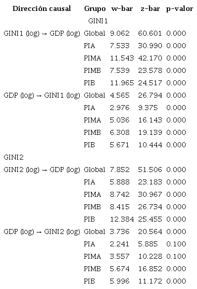 Finalmente, una vez determinada la relación a largo plazo es importante detectar la dirección de causalidad para tales relaciones. Por lo tanto, la prueba heterogénea de causalidad del panel Dumitrescu y Hurlin se emplea para comprender la naturaleza de la relación causal entre las variables del estudio. Este enfoque de causalidad es útil en la corrección de problemas de CD y heterogeneidad (Dumitrescu y Hurlin, 2012). Los resultados de la prueba de causalidad se describen en el Cuadro 12. Primero, al considerar GINI1 se observa una relación causal bidireccional a escala global y para todos los grupos de países según el nivel de ingreso (PIA, PIMA, PIMB y PIB). Por otro lado, al considerar GINI2 se sigue presentando la relación causal bidireccional con el desarrollo económico a escala global y en los PIMB y los PIB; no obstante, en los grupos PIA y PIMA sólo se presenta una relación causal unidireccional que parte desde los niveles de desigualdad hacia el desarrollo económico. Este resultado muestra que, al aplicar los procesos distributivos mediante políticas de redistribución, en los PIA y los PIMA el crecimiento económico no genera modificaciones o cambios sobre los niveles de desigualdad.