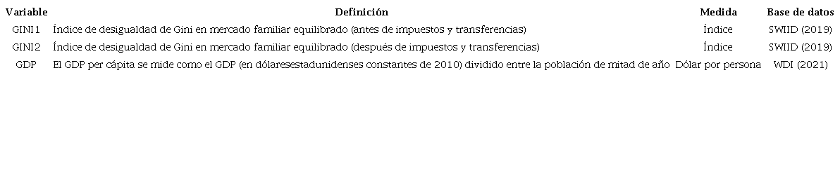 La información estadística utilizada en esta investigación provino de tres bases de datos diferentes. Los coeficientes de Gini antes de impuestos y trasferencias (GINI1) y después de impuestos y trasferencias (GINI2) fueron tomados de los datos publicados en The Standardized World Income Inequality Database (SWIID) (Solt, 2019) versión 8 (véase el Cuadro 1). El índice de Gini presenta una ventaja en la cuantificación de la desigualdad de ingresos, ya que es una medida ampliamente aceptada en todo el mundo y casi todas las agencias gubernamentales e internacionales lo utilizan para resumir la desigualdad de ingresos o riqueza en una nación o en el mundo (Charles, Gherman y Paliza, 2022). Sin embargo, Mucciardi y Benassi (2023) sugieren que definir la desigualdad de forma que permita una medición precisa dista mucho de ser sencillo, debido a la limitación de información que permitiría una ampliación de dimensiones sobre el indicador. Por ello, pese a sus limitaciones, se utiliza una medida o indicador como el coeficiente de Gini para hablar de desigualdad de ingresos en una determinada región.