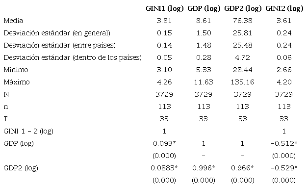 El Cuadro 2 muestra las estadísticas descriptivas de la serie. Las variables forman un panel exactamente equilibrado con 3 729 observaciones durante 33 años (T= 1, 2, …, 33) y 113 países (i= 1, 2, …, 113). El logaritmo del coeficiente de GINI1 es más estable dentro de los países que entre ellos; la desviación estándar dentro de los países es 0.05, y entre sí es de 0.14. Asimismo, el logaritmo del coeficiente de GINI2 muestra una menor variabilidad dentro de los países que entre ellos; la desviación estándar dentro de los países es 0.06, que está por debajo de la que hay entre países de 0.24. Mientras, el logaritmo del crecimiento económico (GDP) tiene una mayor estabilidad dentro de los países que entre ellos; la desviación estándar dentro es aproximadamente 0.28, y entre los países 1.48.