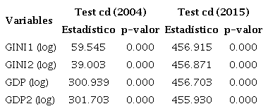 Donde CD es la dependencia de la sección transversal; N es la sección transversal del panel; T es el periodo, y ρij es la correlación transversal de los errores entre i y j.