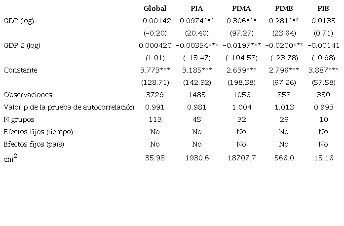 En el Cuadro 4 se reportan los resultados de los FGLS estimados, considerando GINI1 en función del desarrollo económico (GDP), además del desarrollo económico al cuadrado (GDP2), el cual representa la segunda etapa de desarrollo. En los resultados estimados, se observa que el GDP genera un efecto positivo y significativo inicialmente sobre GINI1, en 0.09, 0.31 y 0.28%, para los PIA, los PIMA y los PIMB, respectivamente. Sin embargo, a medida que el desarrollo económico aumenta (GDP2) el efecto pasa a ser negativo y significativo, lo que representa la segunda etapa de desarrollo, en la cual los niveles de desigualdad tienden a disminuir en 0.003, 0.002 y 0.02% para los PIA, los PIMA y los PIMB, respectivamente. Estos resultados validan la hipótesis de la U invertida de Kuznets en los grupos de países según el nivel de ingresos; no obstante, a escala global y en los PIB no presentan resultados significativos que validen la curva de Kuznets.