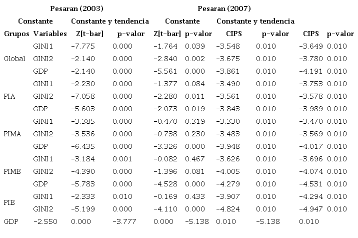 Los principales hallazgos de este estudio son los siguientes. En primer lugar, existen relaciones a largo plazo entre el desarrollo económico y las desigualdades de ingresos (medidas antes y después de impuestos y transferencias). En segundo lugar, se constata que, al considerar subgrupos para el análisis, el desarrollo económico genera efectos distintos para cada uno; asimismo, al considerar la segunda medida de desigualdad (después de impuestos y transferencias), los mecanismos de redistribución sí influyen en los niveles de desigualdad por ingreso, y éstos tienen comportamientos distintos al medir el efecto del desarrollo sobre la desigualdad. En tercer lugar, la hipótesis de Kuznets se valida inicialmente en los grupos PIA, PIMA y PIMB, mientras que, al considerar la segunda medida de desigualdad GINI2, ésta se valida en todo el panel y para las cuatro submuestras. Finalmente, existen relaciones de causalidad bidireccional tanto en la muestra global como en las submuestras al considerar la primera medida GINI1. Por otro lado, cuando se toma la segunda medida GINI2 se observa que de igual forma se presentan relaciones de causalidad bidireccional, excepto en las submuestras de los PIA y los PIMA, donde sólo se encuentra una relación de causalidad unidireccional que va de GINI2 al desarrollo económico.