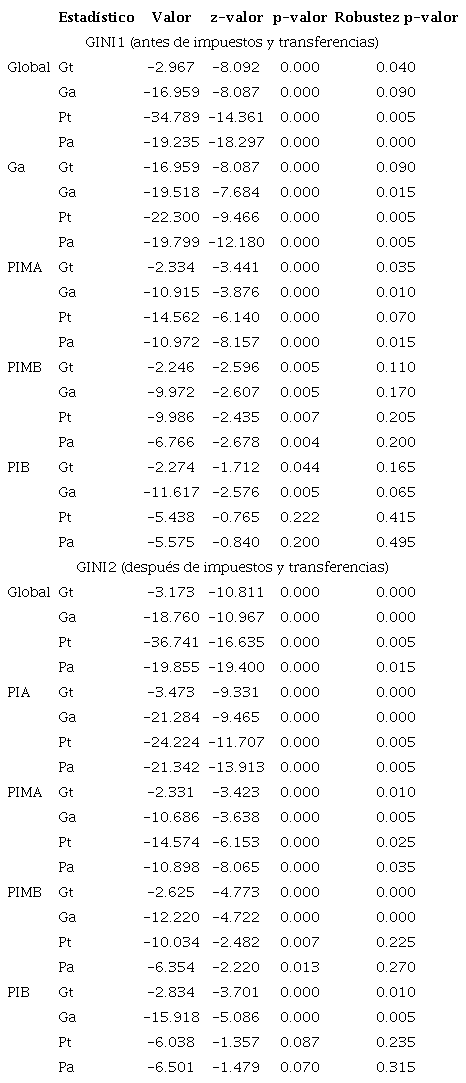 De acuerdo con los resultados de la prueba de cointegración de Westerlund, que se detallan en el Cuadro 7, la hipótesis nula de prueba de no cointegración puede rechazarse; en otras palabras, existe cointegración entre desarrollo económico y los niveles de desigualdad por ingresos, para GINI1 y GINI2 a escala global, y para los PIA, PIMA y PIMB, a excepción de los PIB. La confirmación de la cointegración es una indicación de la existencia de una relación a largo plazo entre las variables del estudio. Estos resultados concuerdan con lo encontrado por Baloch et al. (2018) y Grabarczyk et al. (2018), quienes confirman la existencia de una relación de cointegración a largo plazo entre la desigualdad de ingresos y el crecimiento económico. De igual forma, Akinci (2018) encuentra que estas dos medidas están cointegradas, en una muestra de 65 países, para un periodo similar de estudio.
