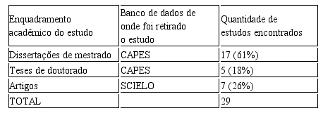 No banco de teses e dissertações da CAPES, o levantamento ficou, em um primeiro momento, entre o período de 1987 (data inicial disponível para consulta) a 20 de agosto de 2013. Nesse período foram encontradas 296 dissertações de mestrado e 81 teses de doutorado. Desses estudos, 29 foram descartados por não se relacionarem diretamente ao tema, obtendo-se, portanto, 348 estudos. Em um segundo momento, no dia 14 de janeiro de 2015, foi feita uma nova busca com as palavras religiosidade, espiritualidade e saúde, e não foram encontrados estudos posteriores a 2012, o que significa não haver nenhuma dissertação de mestrado ou tese de doutorado em 2013 e 2014. Notouse, nesse segundo momento, que a ferramenta de busca de teses da CAPES está mais aprimorada, com uma melhor visualização dos estudos e possibilidades de encontrar informações mais rapidamente, tais como: o autor, a área do conhecimento, instituição de ensino e data da defesa. Todavia, foi encontrado um total de 47 estudos, já visualizados na primeira busca. Ressalta-se a discrepância entre a quantidade de estudos encontrados na primeira e na segunda busca.