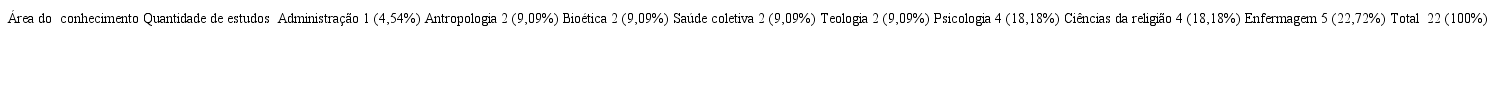 Em relação à produção anual das áreas do conhecimento dos 22 estudos, sobre o período de 1987 a 2012, a Teologia aparenta ter pouquíssima expressividade, com apenas uma produção em 2003 e outra em 2010. Já o campo da saúde produziu em 2003, 2006, 2008 um estudo por ano, sendo um na Psicologia, um na Saúde Coletiva e um na Enfermagem. Em 2009, dois estudos, ambos da Enfermagem; 2010 dois estudos, um da Psicologia e outro da Enfermagem; em 2011 um estudo da Enfermagem; e em 2012 três estudos, dois da Psicologia e um da Enfermagem.