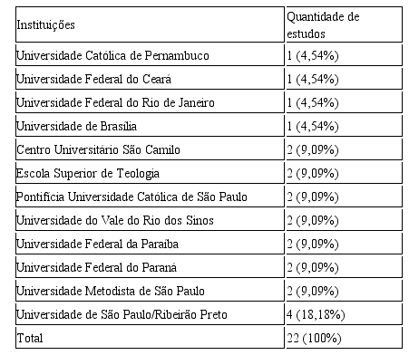 Entre as instituições de ensino dos 22 estudos, destaca-se a Universidade de São Paulo (Ribeirão Preto) como a instituição que mais pesquisou sobre religiosidade/espiritualidade e saúde e profissionais da saúde, com quatro estudos ligados ao campo da saúde: um estudo de Psicologia, um estudo de Saúde Coletiva e dois estudos de Enfermagem.