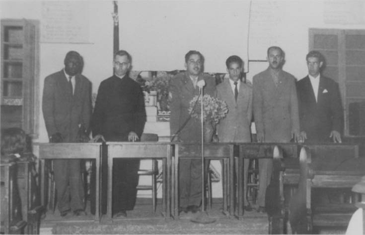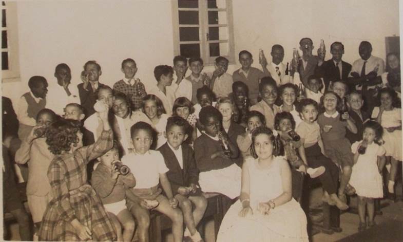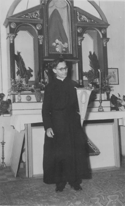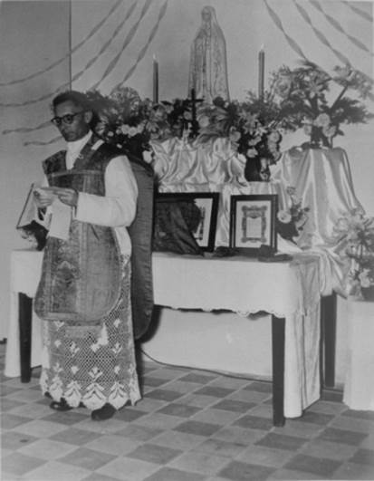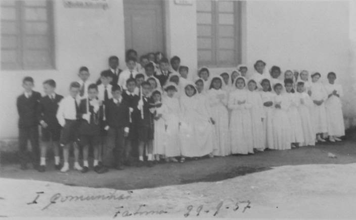 A capela permaneceu funcionando para sacramentos e atividades religiosas, conduzidas pelo Pe. Rambo, na parte da frente da edificação. Nas Figuras 5 e 6 podemos ver, respectivamente, Pe. Rambo diante de um altar improvisado, na capela da escola, e uma turma de catequese, no dia de sua primeira eucaristia.