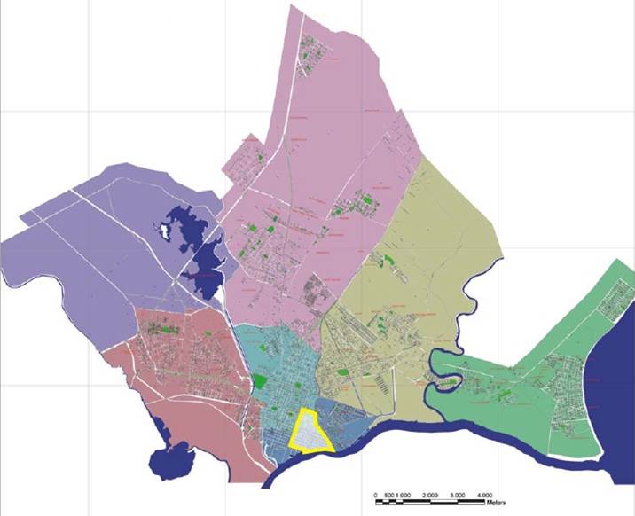 Em amarelo, a sudeste, demarcada a Zona da Várzea