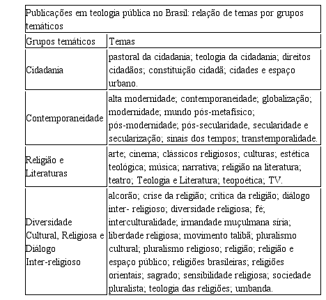 Com o intuito de sintetizar o caminho exposto acima, busca-se uma apresentação didática dentro de uma nova configuração visual. Assim, a tabela abaixo apresenta a relação de temas tratados nas pesquisas sobre teologia pública no Brasil a partir dos assim chamados grupos temáticos, conforme tabela 1: