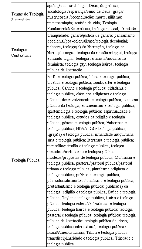 Ao se considerar que o mapeamento acima mencionado foi efetuado no contexto das publicações relacionadas à teologia pública, é pertinente notar que essa proposta teológica, apesar de sua polissemia, tem atuado de forma a identificar os temas candentes nos espaços públicos com que se relaciona. Ao se utilizar a tipologia proposta por David Tracy – em que a teologia se ocupa, basicamente, de três públicos: a igreja, a academia e a sociedade –, conclui-se que essa teologia pública disposta a investigar a cidadania acadêmica da teologia, bem como sua epistemologia, está mais próxima do público acadêmico.