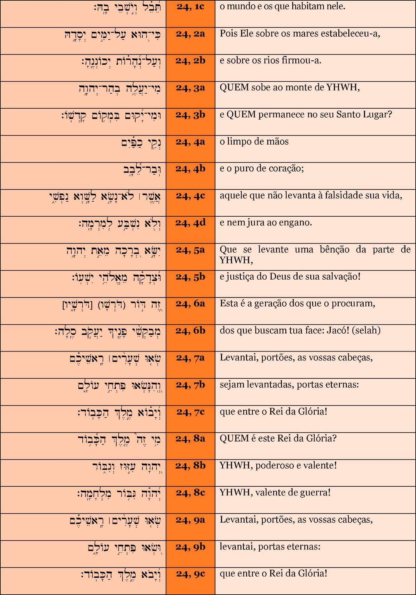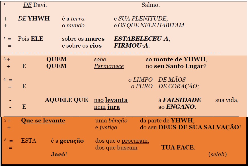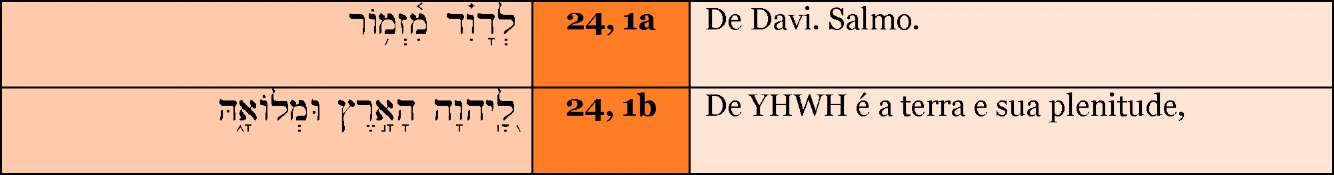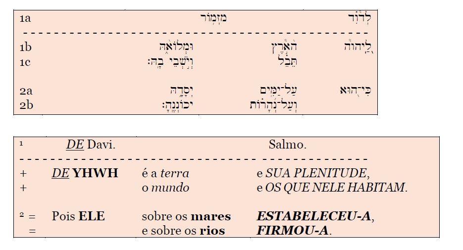 No início do v.1 a ordem mais comum seria Salmo de Davi; a disposição de duas únicas palavras como título na ordem De Davi. Salmo é incomum, aparecendo desta forma também em Sl 101, 1; 110, 1 (GERSTENBERGER, 1988, p. 117). A expressão De Davi. Salmo aparece ainda junto ao termo לַמְנַצֵּחַ no início de outros 4 salmos da Bíblia Hebraica (KITTEL,1997): 40, 1; 68, 1; 109, 1; e 139, 1. Então é preciso rever esta afirmação ou pelo menos justificar como aparece. Já na forma inversa: Salmo. De Davi, aparece 28 vezes no início de salmos na Bíblia Hebraica, como temos no Sl 23 e outros antes e após, enquanto que a expressão Salmo. De Davi é encontrada no início dos Salmos 19 a 23, que antecedem o Sl 24. De Davi faz paralelo com De YHWH mediante a preposição ל, ligando o título ao restante do salmo. Não somente אֶרֶץ está em paralelo com תֵּבֵל, e מְלוֹא. em paralelo com :וְיֹשְׁבֵיבָהּ: a palavra תֵּבֵל, especialmente na literatura sapiencial, implica na totalidade da humanidade (TERRIEN, 2003, p. 246), permitindo que os segmentos dos vv. 1b-2b formem um paralelismo perfeito, ao esclarecer que são os habitantes da terra, a plenitude do mundo, que constitui alvo das atenções de YHWH, ou seja, das bênçãos do Senhor (MEYNET, 2018, p. 304).