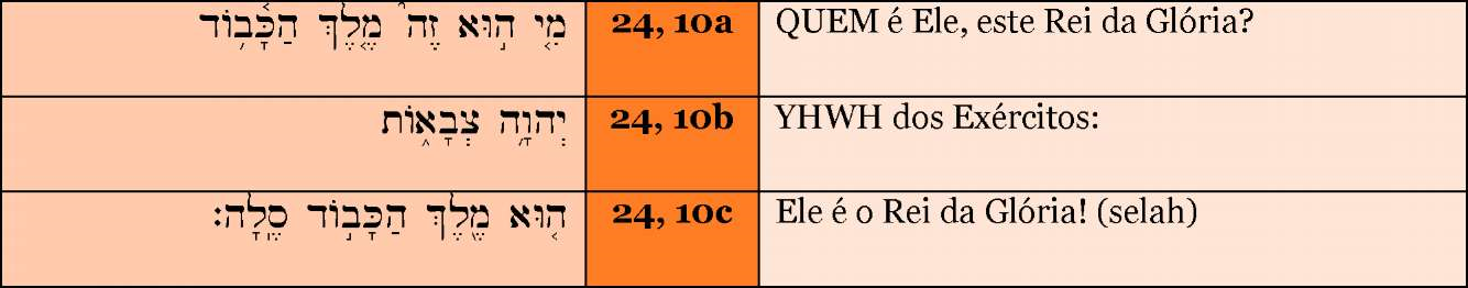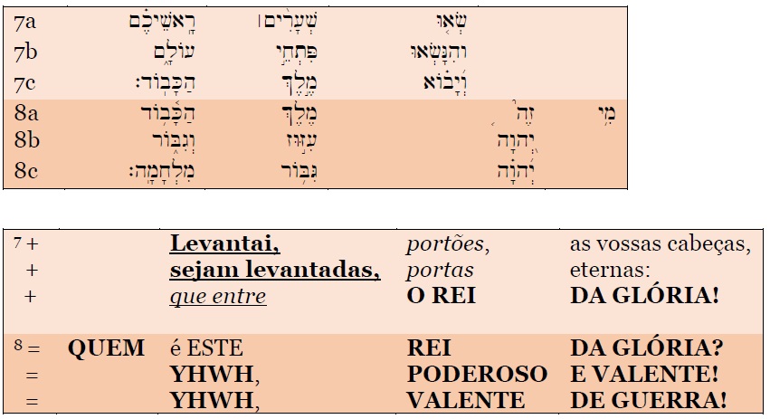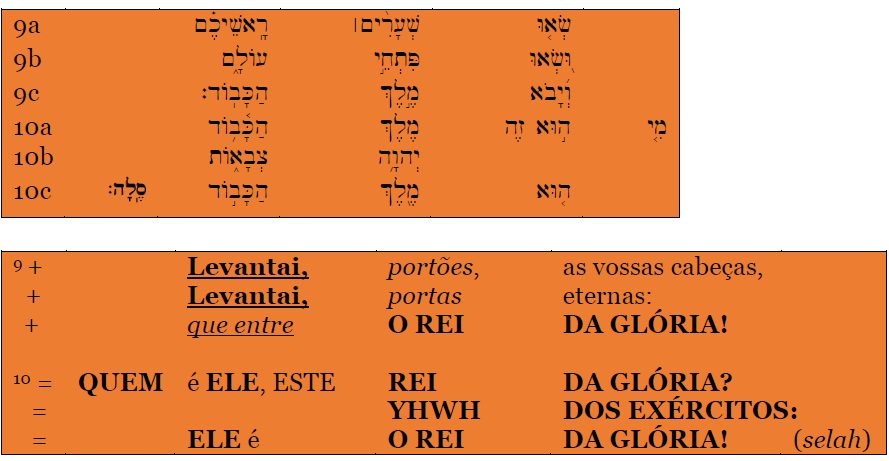 A frase Rei da Glória, que identifica “[...] um personagem misterioso que aparece diante da porta” (RAVASI, 1997, p. 462), é exclusiva deste salmo, formando um sintagma idêntico que aparece cinco vezes e apenas aqui: vv.7c.8b; 9c.10b.10c (MEYNET, 2018, p. 302). O tradicional deus jebusita é conhecido como Melek, o Rei do Subterrâneo, suplantado por YHWH, o Deus que habita em glória (cf. Is 6, 3), presente na arca (cf. 1Sm 4, 21) e que agora vem pessoalmente tomar posse do Templo (GOULDER, 2006, p. 471-472). Este é YHWH, como bem mostra o paralelo. Na frase interrogativa מִי זֶה, o pronome זה é unido encliticamente como um advérbio para comunicar franqueza e força, a exemplo do que também se atesta em Sl 25, 12 (DAHOOD, 2008, p. 153). A duplicação da última consoante de עִזּוּז produz não somente aliteração, como também amplifica o adjetivo עַז, permitindo uma associação inequívoca com o poder divino (LANDY, 2003, p. 278). Isto faz com que עִזּוּז se aproxime do clássico termo herói (LANGE, 2008, p. 187). Desta forma, YHWH é descrito pelo tom belicista como o guerreiro que derrotou seus inimigos, digno de louvor maior do que o tributado aos portões da cidade e às largas portas do Templo (BOTHA, 2009, p. 548; GONZAGA, 2018, p. 158). Esta é a sua glória, amplificada pelos títulos dispostos quiasticamente: Poderoso e Valente / Valente de Guerra.
