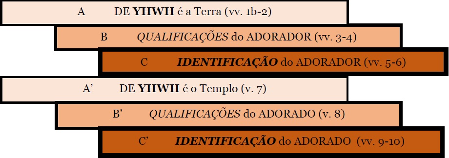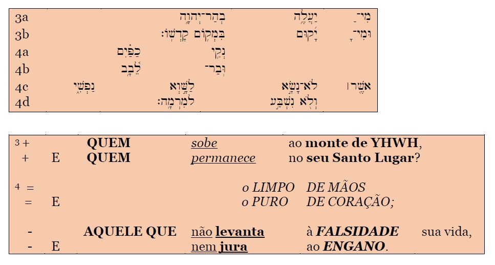 A pergunta determinante usa o pronome ymi, acerca de quem estaria qualificado para subir ao monte de YHWH. Este não é outro lugar senão seu Santo Lugar, pelo qual o ato de subir envolve na verdade permanecer. Esta identificação ainda é garantida estilisticamente pela aliteração produzida entre יָקוּם e מָקוֹם (BOTHA, 2009, p. 541). Uma estrutura diferenciada encontra-se no v. 4: ressalta-se o caráter desejado daquele que se candidata a estar no Templo em termos do que uma pessoa deve ser positivamente tanto quanto o que ela não pode ser, criando um quadro completo, um merismo (DUKE, 2011, p. 224). Este merismo evidencia-se por uma estrutura quiástica, com dados positivos e negativos, dados internos e externos. Assim, a total pureza do adorador é expressa em quatro características: positiva externa (4a); positiva interna (4b); negativa interna (4c); e negativa externa (4d) (DUKE, 2011, p. 225-226).