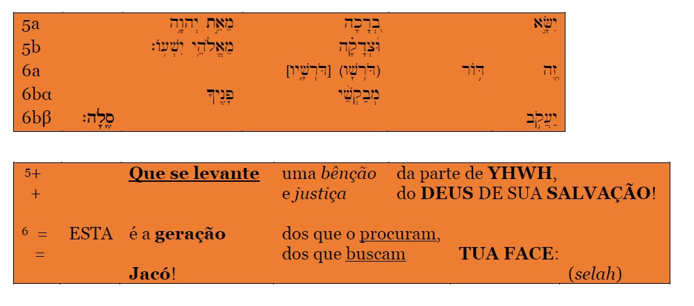 A expressão dos que o buscam é uma bem conhecida autodesignação dos editores do Saltério, tornando as questões postas nos vv. 3-4 uma confirmação do papel da comunidade como os verdadeiros adoradores que receberão a bênção de YHWH (BOTHA, 2009, p. 546-547; AGOSTINHO, 1997, p. 221), que “[...] nos vem graças à misericórdia de Deus” (ODEN, 2017, p. 262). O v. 6 está disposto quiasticamente, de tal forma que geração está em paralelo com Jacó, sublinhado ainda pela ênfase posta no pronome demonstrativo זֶה: “[...] esta é a geração, Jacó, e nenhuma outra” (SUMPTER, 2014, p. 37-38). Não indiscriminadamente todo o Israel, mas Jacó, no qual buscar é o oposto da autoconfiança (DUKE, 2011, p. 231). Há uma aliteração entre דׇרַשׁ e דּוֹר (BOTHA, 2009, p. 541). Assim, a referência a Jacó funciona como um rito de passagem: a entrada no Templo assemelha-se à passagem de Jacó pelo Jaboc, lembrando o episódio narrado em Gn 32, 23-33 onde a reentrada de Jacó na Terra da Promessa estaria condicionada à demonstração de sua integridade (SPANGENBERG, 2011, p. 752). Por isso o uso do yiqtol volitivo: o desejo que se levante essa geração de Jacó, cumprindo as expectativas de Gn 12, 3 de que todos os clãs da terra tornar-se-iam nessa raça (TERRIEN, 2003, p. 248) e ecoando Noé, o único de sua geração visto justo (cf. Gn 7, 1) e que corporifica e antecipa a geração justa que está por aparecer (HUNTER, 2007, p. 200-201). Mais do que uma geração a ser abençoada, pela disposição retórica ela é a própria bênção que deve ser levantada da parte de YHWH, a justiça do Deus Salvador, ecoando Gn 15, 6. E aqui vale a pena ressaltar que o verbo “levantar” domina o cenário do Sl 24, 4b.5a.7ab.9ab (MEYNET, 2018, p. 302).