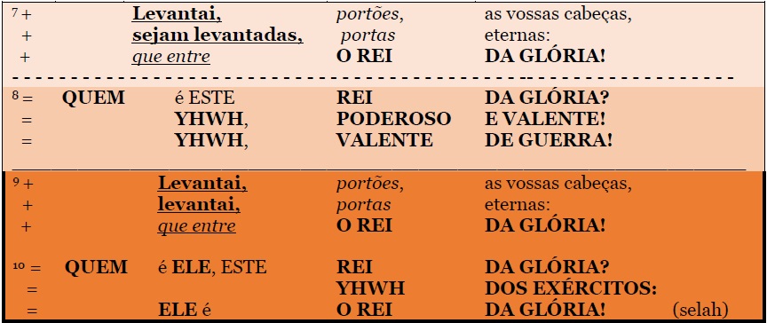 Esta parte do salmo é facilmente identificável pela presença do título Rei da Glória, e por ser formada pelos únicos segmentos trimembros da passagem. Com o refrão dos vv. 7 e 9 e a presença de perguntas similares nos vv. 8 e 10, a princípio serão analisados esses dois pares separadamente.
