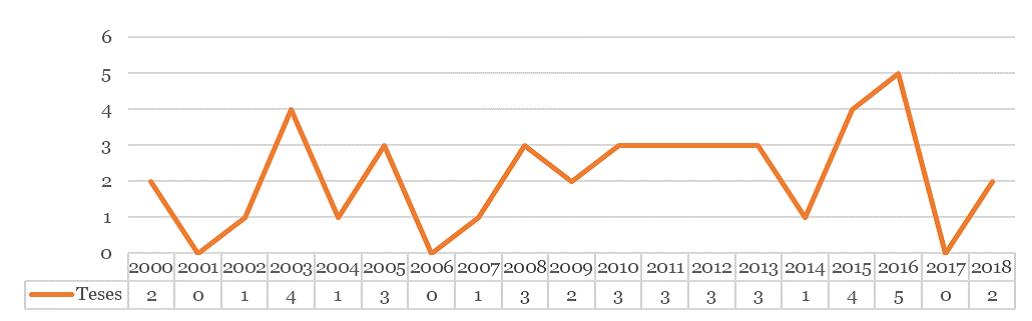 Verifica-se que desde as duas primeiras Teses, identificadas no ano de 2000, até o primeiro semestre de 2018, o número de trabalhos não é regular. Há períodos sem nenhuma defesa (2001-2006-2017), e até 2016 com um número significativo de cinco publicações. É necessário ainda aguardar um lastro maior de tempo e publicações, para verificar empiricamente o potencial deste tema, e trata-lo como objeto de pesquisa, assim como as três áreas como maior concentração de pesquisa são Educação (14), Teologia (11) e Ciência da Religião (07), compreensivo por ser uma questão vinculada a escola e aos estudos de religião.