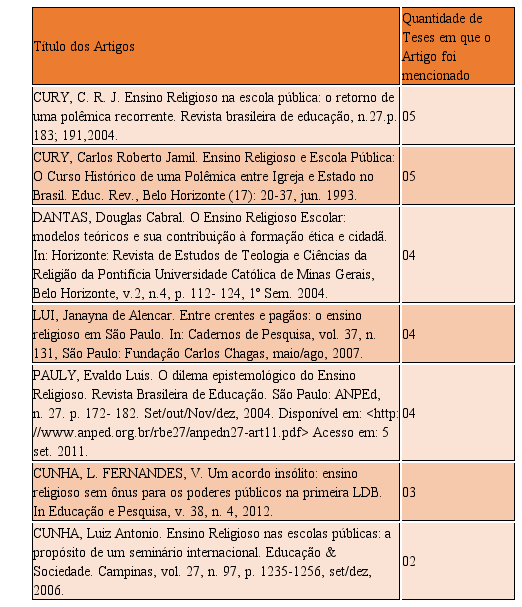 Quanto aos artigos, verifica-se uma presença menor do uso de textos dos periódicos. E entre os autores mais referenciados estão JUNQUEIRA (11 textos); CUNHA (04 textos). E com dois textos os seguintes autores: CANDIDO, CURY, GIUBELLI e SOARES. Ainda, em 38 das TESES aqui mencionadas 07 não utilizaram nenhum artigo para sustentar seus argumentos.