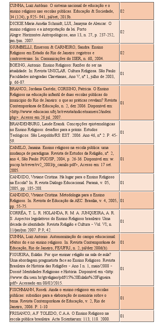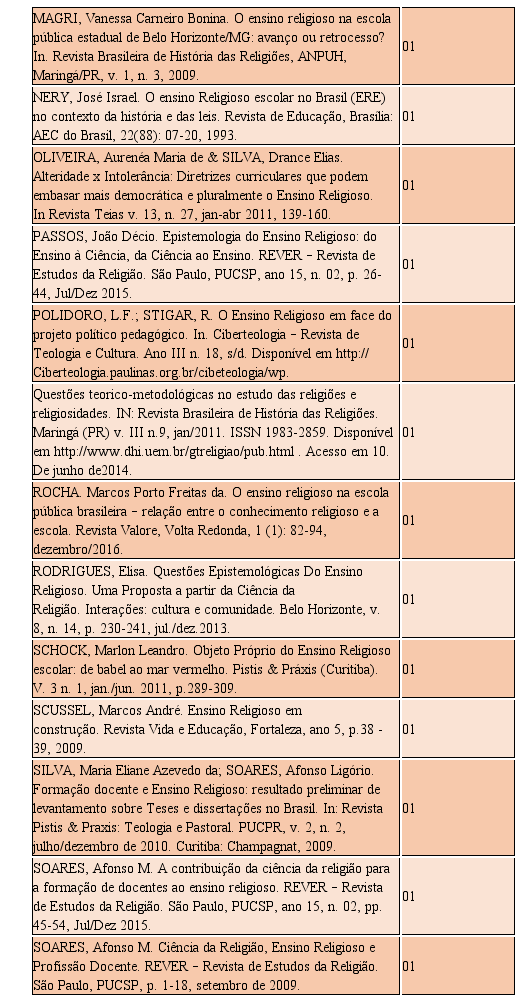 Uma primeira verificação é que as fontes mencionadas nas Teses nem sempre estão atualizadas, são recorrentes e de bibliografia nem sempre específica que fundamenta a área de pesquisa proposta pelos autores. Outra questão em destaque é o fato de que a Ciência da Religião compreendida desde 2014, como ciência acadêmica que fundamenta a Área de Ensino Religioso, ainda não é explicitada nas Teses relacionadas.
