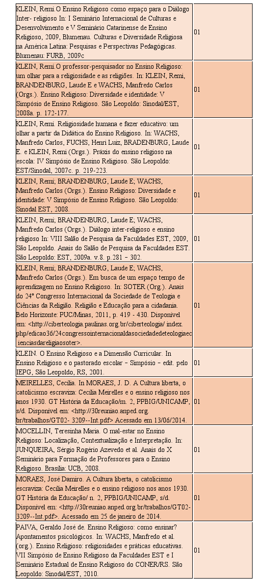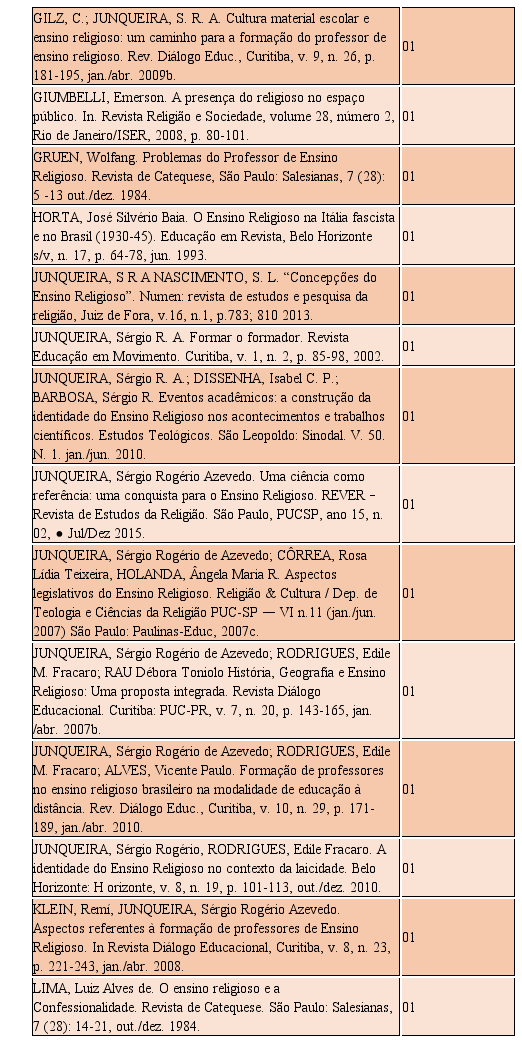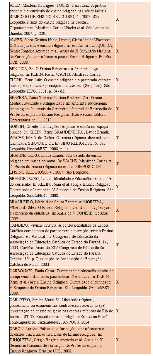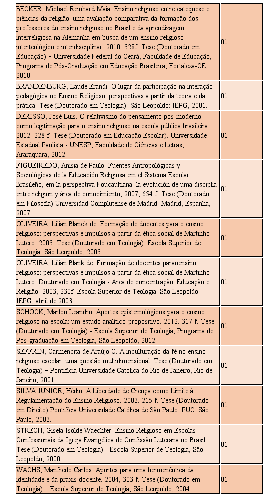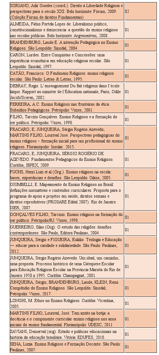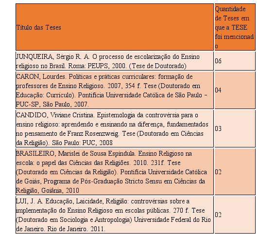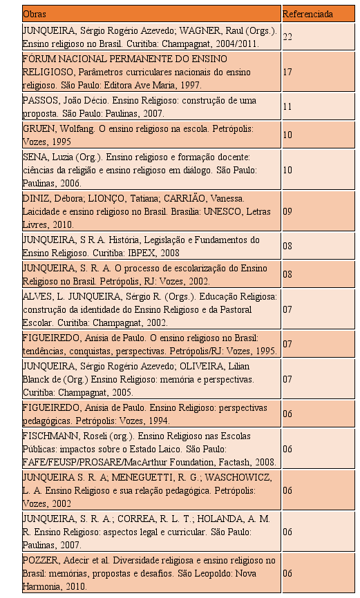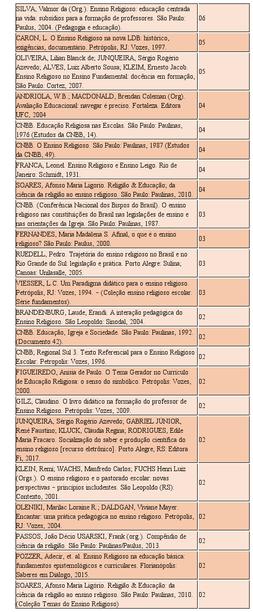 Entre os livros mencionados, nas 38 Teses que utilizaram obras teóricas sobre o Ensino Religioso, foram verificados 63 livros. Sendo que em alguns textos, das obras mencionadas, verifica-se uma autorreferência. Ou seja, o orientando mencionou seus próprios trabalhos, que por sua vez não foram referenciados por mais nenhum outro pesquisador. Entre os autores mais referenciados destacam-se JUNQUEIRA (14 obras); CNBB (05 obras); com três obras FRACARO, FIGUEIREDO e BRANDENBURG; sendo com duas obras: CARON, SOARES, POZZER, PASSOS e KLEIN.