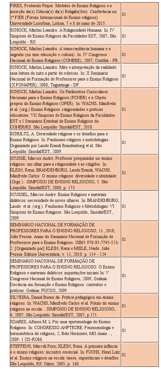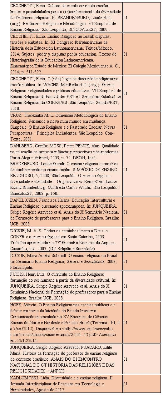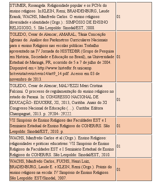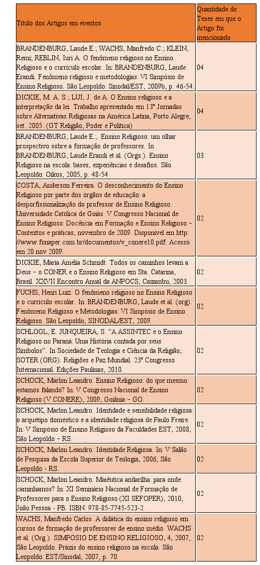 São identificados aqui 66 trabalhos, apresentados em eventos, sendo que os mais utilizados foram artigos de eventos, promovidos pela Faculdade EST e por eventos do Fórum Nacional Permanente do Ensino Religioso. O destaque para a EST é compreensível, pelo fato de existir um número significativo de orientandos desta instituição.