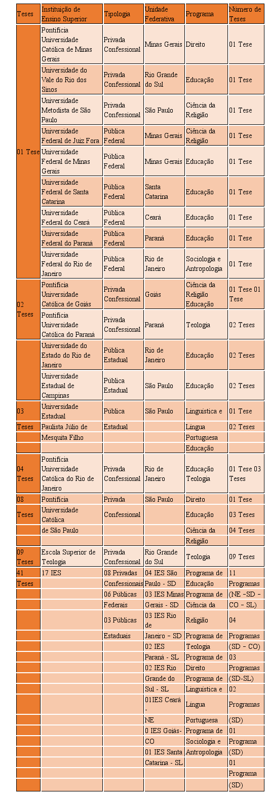 Destas Teses 24 foram defendidas em programas da Região Sudeste (Minas Gerais – Rio de Janeiro e São Paulo); 14 na Região Sul (Paraná – Santa Catarina – Rio Grande do Sul); 03 Teses em outras Regiões (01 Nordeste/ Ceará e 02 Centro Oeste/ Goiás). Não temos registro de trabalhos efetivos na Região Norte. O maior número de Teses defendidas ocorre na área de Programas em Estudos da Religião (21 Teses); 07 em Ciência da Religião e 14 em Teologia. A segunda área é com certeza a Educação (11 Programas) com 16 Teses. Finalmente em três Programas (Direito; Linguística e Língua Portuguesa e de Sociologia e Antropologia) foram defendidas 04 Teses. Estes trabalhos foram aprovados em 17 Instituições de Ensino Superior, sendo 08 em Instituições Confessionais e 09 Instituições Públicas (06 Federais e 03 Estaduais).