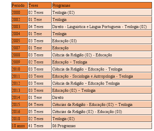Especificamente no campo do Ensino Religioso a primeira Tese defendida em um programa de pós-graduação no Brasil tem o seu registro no ano de 2000 na Pontifícia Universidade Católica do Rio de Janeiro. Em um programa de Teologia, que foi até 2018, foram localizadas quarenta e uma Teses, que de alguma forma sempre discute o Ensino Religioso no cenário brasileiro.