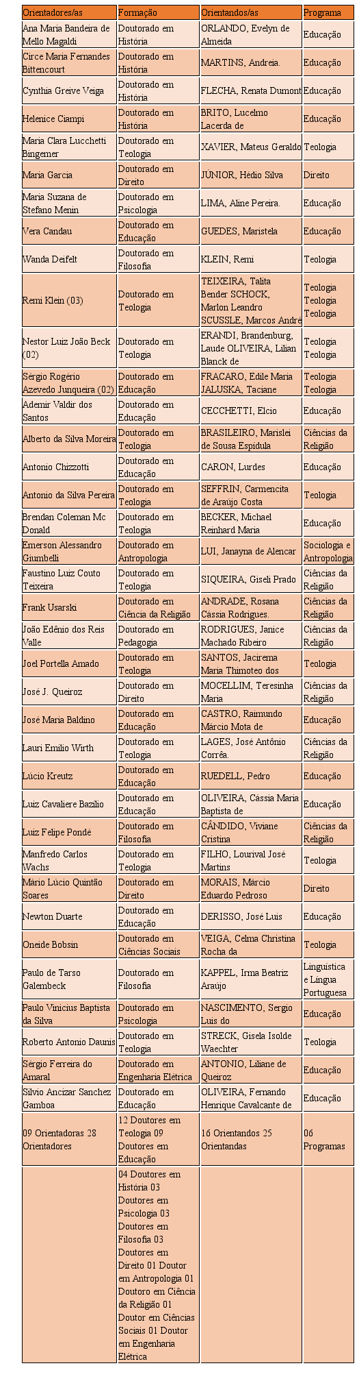 Entre os 37 Orientadores/as, dos 41 pesquisadores, foram localizados professores com formação em áreas como Teologia (12); Educação (09); História (04); Psicologia, Filosofia e Direito (03). Porém, com formação em Ciência da Religião foi encontrado apenas um. Há ainda nas áreas de Antropologia, Ciências Sociais e Engenharia Elétrica. Informações estas recolhidas na Plataforma Lattes. Ao confrontar a formação e a pesquisa dos Orientadores verifica-se que Ensino Religioso não é o campo de estudo da maioria destes profissionais, ou então são de áreas aproximadas. Isto é verificado na bibliografia utilizada (ARAÚJO, 2006, p. 11-12), assim como constatado nos argumentos que não acompanham os estudos realizados e atualizados no que se refere ao Ensino Religioso.