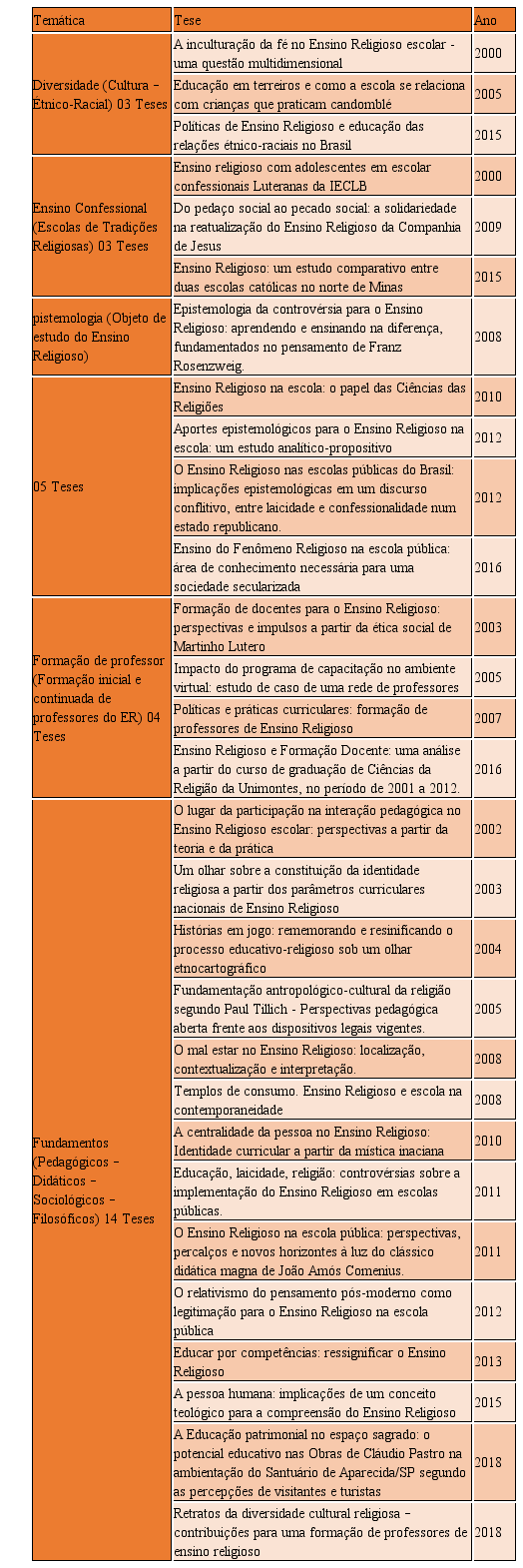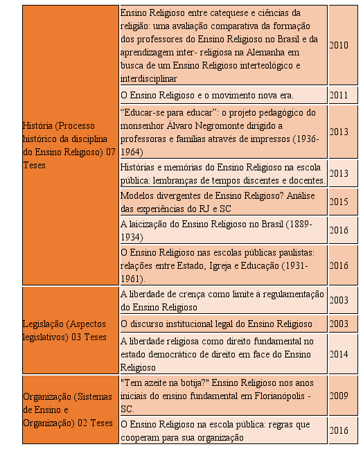 A partir dos assuntos, desenvolvidos nestas 41 Teses, propomos uma classificação nos seguintes temas: História do Ensino Religioso e no cenário da Educação (07 Teses). Sobre as Legislações e Organização da disciplina no Sistema de Ensino (05 Teses). E Epistemologia, sobre o que estudar no Ensino Religioso (05 Teses). Quanto aos Fundamentos pedagógicos, didáticos, sociológico e filosófico para estruturar a disciplina (14 fundamentos). Assim como os trabalhos sobre a Formação dos professores, tanto a formação inicial, quanto à continuada, para o Ensino Religioso (04 Teses). Dois temas específicos e tangenciais sobre o Ensino Confessional (03 Teses); e da Diversidade no campo da cultura e étnico-racial (03 Teses).