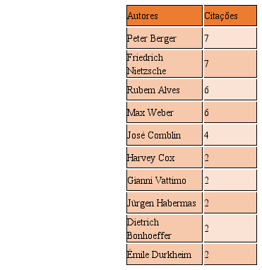 A quarta questão (tabela 3) diz respeito aos autores mais citados por número de pesquisas. Peter Berger e Friedrich Nietzsche são os mais citados nas pesquisas. Rubem Alves aparece em terceiro lugar, ao lado de Max Weber.