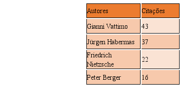 A quinta questão (tabela 4) analisada apresenta determinado conflito em relação a questão anterior. Em relação aos autores mais citados por obras, Gianni Vattimo é o primeiro colocado com 43 citações (o autor é citado em apenas duas pesquisas) e, Jürgen Habermas o segundo, com 37 citações.