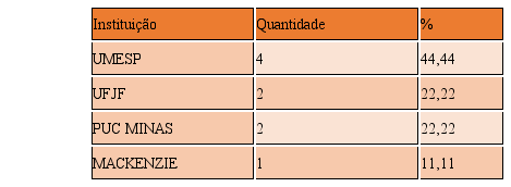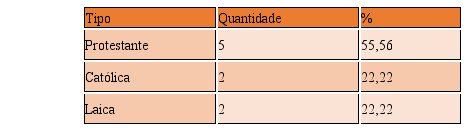 A nona questão (tabela 8) trata da confessionalidade das instituições. As instituições de confessionalidade protestante: UMESP e Mackenzie produziram cinco das nove pesquisas (1 teses e 4 dissertações), correspondendo a 55,56% das pesquisas. A PUC Minas, de confessionalidade católica, produziu duas pesquisas (2 dissertações), correspondendo a 22,22%, e a UFJF (1 tese e 1 dissertação), instituição leiga, também produziu duas pesquisas (1 tese e 1 dissertação) correspondendo também a 22,22%. Desse modo, foi possível constatar que as instituições confessionais (cristãs) responderam por 77,78% da produção acadêmica sobre a secularização, e a instituição pública e laica, respondeu por 22,22%.