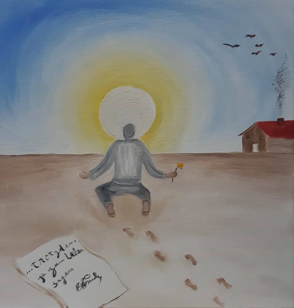 O dia da libertação é representado por meio da Figura 10. O ser humano volta a ser humano na medida em que é um ser que decide e se guia por sua dimensão espiritual. Isso pode ser apreendido por meio de suas pegadas na terra. O ex-prisioneiro se ajoelha perante o sol que resplandece no horizonte. Agora, o manuscrito da sua existência está no passado, mas a vida se vive de forma prospectiva, esperando novas marcas para reconstruí-la. Na folha de papel perdida na terra está escrito: trotzdem Ja zum Leben sagen (FRANKL, 1977), ou seja, dizer sim à vida apesar de tudo, uma condição necessária para continuar o seu caminhar no mundo sem perder a esperança no Logos incondicional da existência, representado aqui por meio do sol.