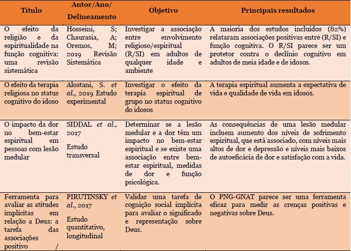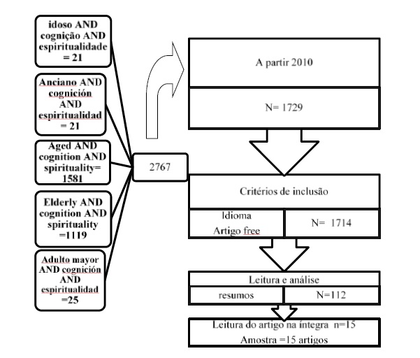 Realizou-se o levantamento bibliográfico por meio de busca eletrônica nas seguintes bases de dados: Biblioteca Virtual em Saúde, National Library of Medicine (PubMed. Gov), além do Portal de Periódicos do Centro de Aperfeiçoamento de Pessoal em Nível Superior (CAPES) e o Google Acadêmico. Para localização dos artigos utilizou-se os Descritores em Ciências da Saúde (DeCS): idosos and cognição and espiritualidade, anciano and cognición and espiritualidad, elderly and cognition and spirituality, aged and cognition and spirituality, adulto mayor and cognición and espiritualidad. O descritor cognição foi utilizado para investigar se existe benefício cognitivo com as práticas religiosas e espirituais, comprovado nos resultados em tabela.