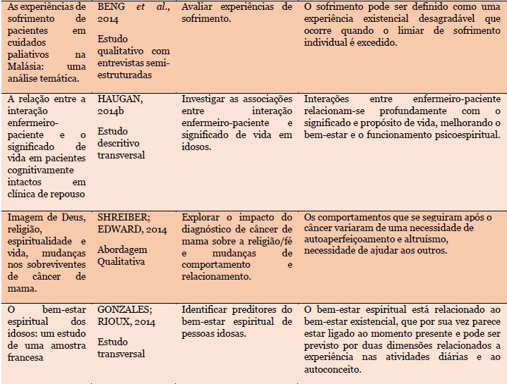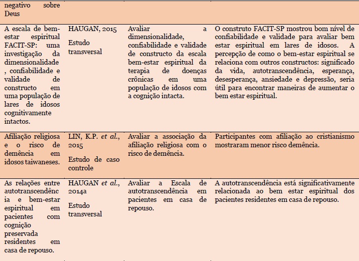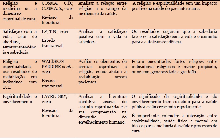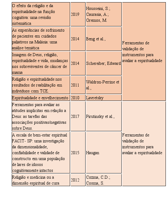 Os artigos selecionados da categoria: ferramentas e validação de instrumentos de avaliação nos indicam os instrumentos FACIT-SP, FICA, SWBS e SDAT são validadas cientificamente e psicometricamente aceitáveis em avaliações de contexto espiritual. Os resultados selecionados nas demais categorias mostram que os pacientes que desenvolvem a religiosidade e espiritualidade podem melhorar o bem-estar e funcionamento psicoespiritual, adquirindo mais conhecimento de si e elementos fundamentais como sabedoria, bem-estar espiritual (conforto e resiliência) e autotranscedência (esperança e altruísmo) que são elos para a melhor aceitação da velhice, enfrentamento de doenças e finitude.