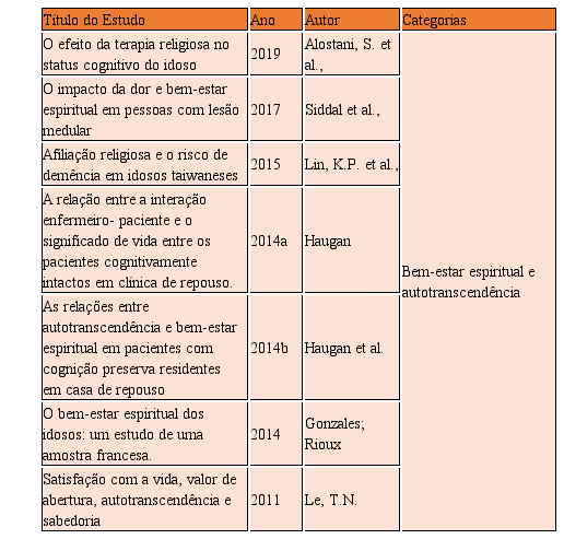 O estudo de revisão integrativa com o objetivo de analisar e sistematizar o tema: espiritualidade e velhice, no período de 2010 a 2019, em literatura científica nacional e internacional apontam as seguintes considerações: 15 artigos foram selecionados para compor as categorias, sendo evidenciado em sua maioria 7 artigos de estudo transversal e 5 pertencentes aos anos de 2014; nos remetendo a organizar três categorias: Ferramentas e validação de instrumentos de avaliação espiritual; Espiritualidade, velhice e sofrimento; Bem-estar espiritual e autotranscedência. A importância da espiritualidade e a religiosidade para os idosos são achados unanimes nos estudos avaliados.