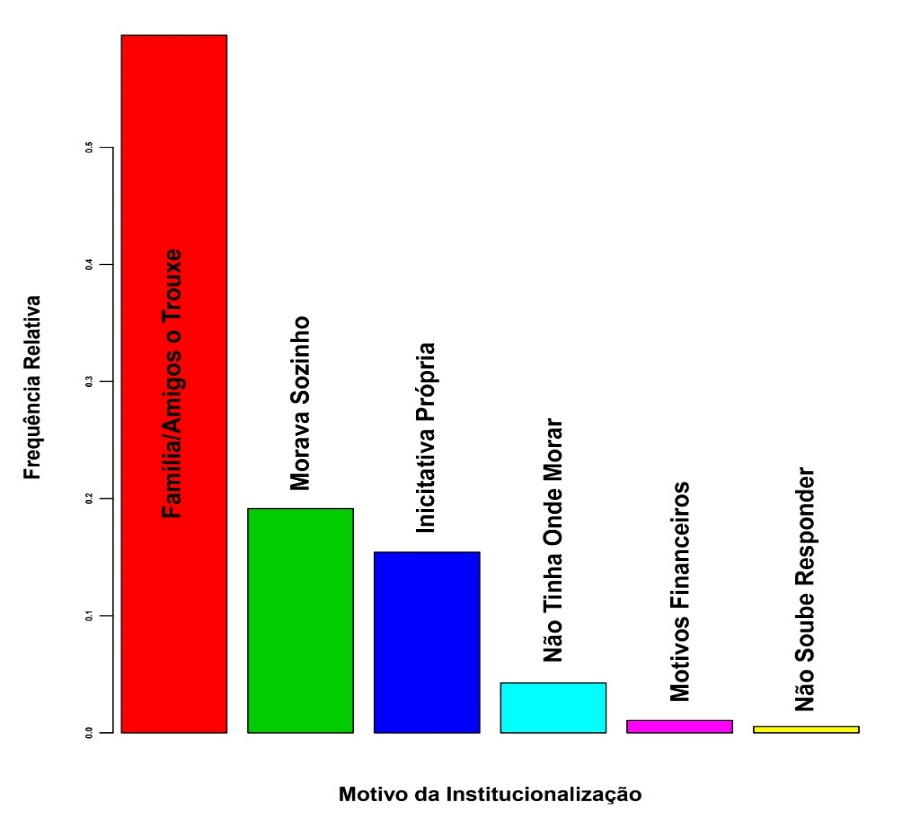 Ao tratar da escolaridade, a maioria das pessoas idosas (67,02%) tem Ensino Fundamental, as demais são analfabetas (23,40%). Ao serem questionadas sobre se haviam tido filhos/as, predominou a resposta sim (63.83%), dado relevante, pois se reflete na questão que diz respeito ao motivo de institucionalização evidenciada no gráfico 1. O referido gráfico aponta que a institucionalização é promovida em maior número pela família, amigos/as e parentes.