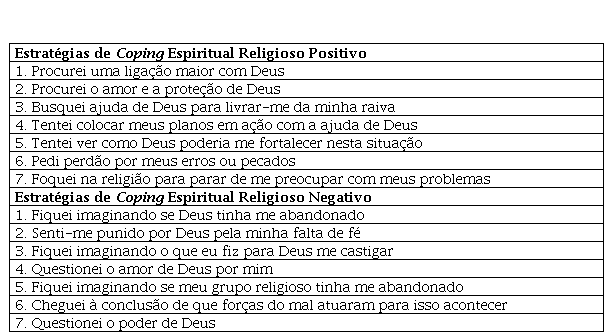 O CER refere-se à utilização de elementos sagrados na forma de responder aos eventos estressores, sendo que os métodos podem ser positivos ou negativos (PARGAMENT; KOENIG; PEREZ, 1998). O que compõe um padrão de CER Positivo são os métodos de enfrentamento com configuração positiva frente a Deus; coping religioso colaborativo; busca de suporte espiritual, transformação de vida, dentre outros (PARGAMENT; KOENIG; PEREZ, 1998, p. 712). Já o CER Negativo expressa-se por meio de um relacionamento menos seguro com Deus; uma visão de mundo frágil e ameaçadora, e conflitos espirituais na busca por significado (PARGAMENT; KOENIG; PEREZ, 1998, p. 712).